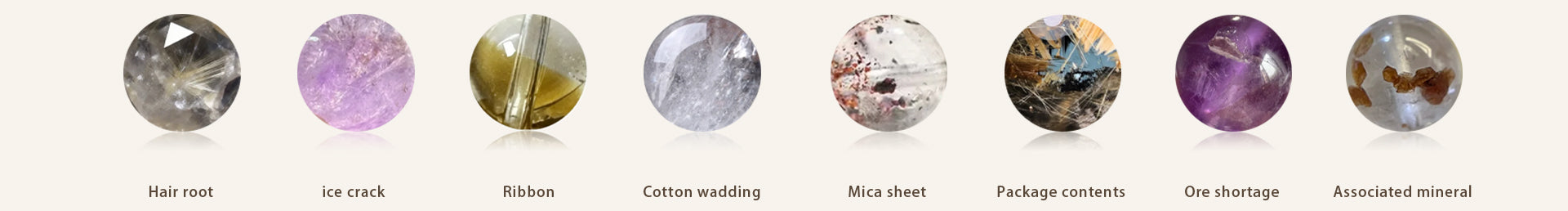 天然水晶經過上千萬年在地底生長,在生長過程中,難免會形成一些天然印記。常見的如冰裂紋、內含物、礦缺、棉絮、雲母片、色帶等,皆是天然水晶的正常特徵,並非是瑕疵。